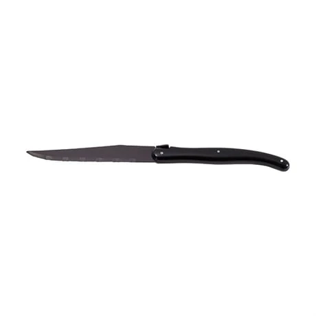 Ces couteaux sont des couverts de haute qualité, dotés d’une lame en inox pleine soie et d’un manche en ABS. La lame est recouverte d’un film noir déposé à très haute température, composé de titane, de zirconium et de chrome. Les lames sont micro-dentées pour une découpe très efficace de tous vos aliments.