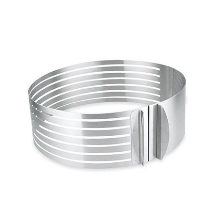 En inox, le Cercle à trancher extensible de Mathon vous permet de découper facilement des tranches parfaitement égales dans vos génoises ou autres gâteaux.