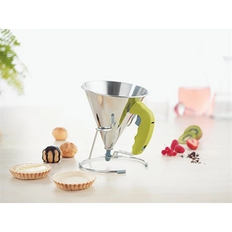 L’entonnoir est doté d’un support inox et silicone pour poser votre ustensile en cours de réalisation ou lors de son remplissage. Sa poignée ergonomique en polyamide assure une bonne prise en main. L’entonnoir à piston passe au lave-vaisselle.