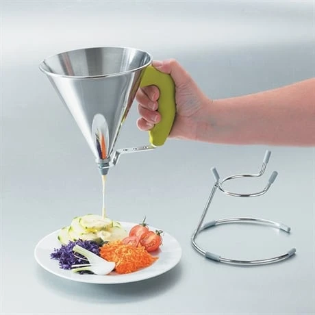 L’entonnoir à piston De Buyer vous permet de décorer vos assiettes, garnir vos mignardises et choux pâtissiers, remplir vos verrines avec précision, etc. Vous pouvez régler le débit de l’entonnoir directement sur la poignée, pour un dosage précis.