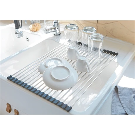 L’égouttoir filaire Mathon se pose sur votre évier et permet à votre vaisselle de s’écouler sans mettre de l’eau partout. Il mesure 45 x 33 cm et s’enroule lorsque vous n’en avez pas besoin pour prendre peu de place dans vos placards. Cet égouttoir en inox est équipé de bords en silicone anti-dérapant pour assurer sa stabilité sur votre évier. Vous pouvez également vous en servir de repose-plat car il ne craint pas la chaleur. Pour l’entretenir, de l’eau chaude savonneuse suffit.