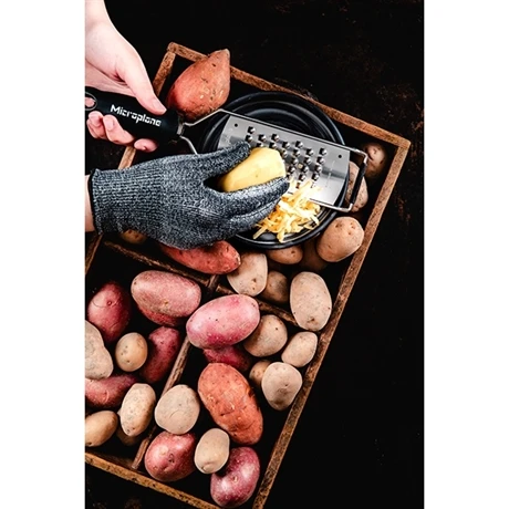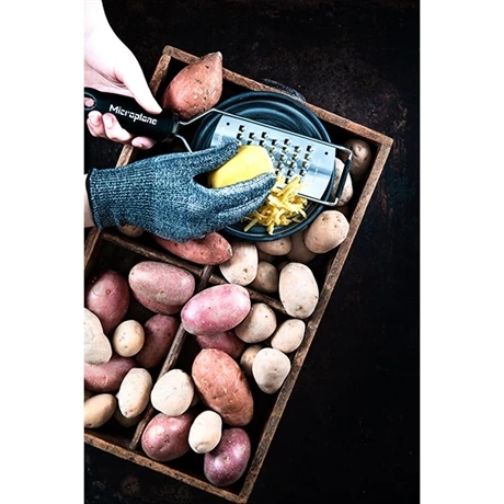 Le gant anti-coupures Microplane protégera votre main idéalement lors de l’utilisation des râpes Microplane, mais peut tout à fait être utilisé avec des produits d’autres marques, exceptés les couteaux de cuisine qui risqueraient de traverser la membrane. Conçu dans un mixe de fibres de verre, nylon et élasthanne, ce gant résiste parfaitement au contact du métal et vous évitera de râper ou zester votre peau, tout en restant flexible pour s’adapter à la majorité des mains, puisqu’il est vendu en taille unique.