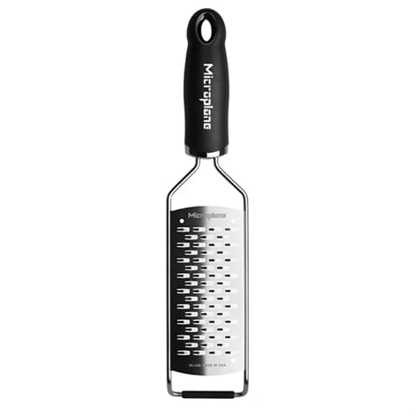 Après avoir révolutionné le domaine des râpes et zesteurs en intégrant un outil de menuiserie dans le monde culinaire, Microplane part de son modèle Premium Classic qui a séduit les cuisines des plus grands chefs pour les spécialiser dans des champs de compétences spécifiques. La râpe à fromage double tranchant Gourmet noir Microplane est faite d’une lame en acier inoxydable, découpée par photochimie pour une partie en un seul bloc bien plus résistante à l’usure, avec un tranchant dans les deux sens. Vous pourrez augmenter la vitesse de râpe grâce à cette fonctionnalité, et ses trous élargis sont faits pour un résultat en ruban : copeaux de parmesan, carottes, courgettes, patates, chocolat, la lame est taillée de manière à éviter de déchiqueter ou écraser les aliments pour un résultat optimal.