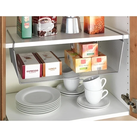 A suspendre sur une étagère, ce panier résistant en métal permet de ranger des vêtements, du linge, de la vaisselle, des aliments en offrant un espace de rangement supplémentaire.