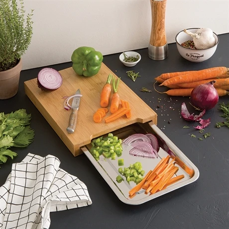 Situé sous la planche, ce tiroir coulissant est amovible. Vous pouvez le tirer lorsque vous utilisez la planche pour accueillir vos aliments et enchainer les découpes ou collecter vos déchets. Après utilisation, le bac collecteur passe au lave-vaisselle et se glisse aisément sous la planche pour gagner de la place dans vos placards.