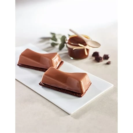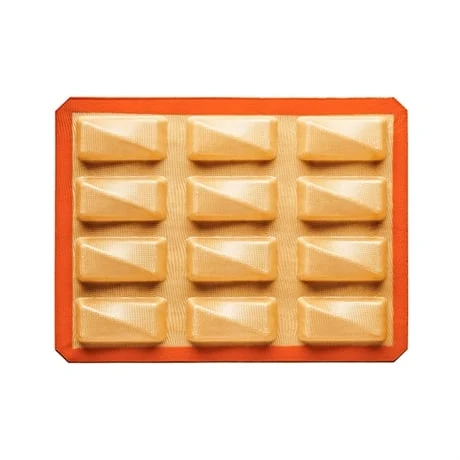 Le moule Silpat de 12 barres torsadées a des dimensions de 40 x 30 x 2,45 cm. Les 12 empreintes mesurent 10 x 4,5 x 2,45 cm ce qui est idéal comme format de goûter, d’entremet individuel ou de snacking.