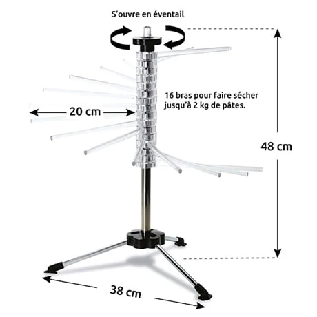 Il est doté de 16 bras permettant d’étendre jusqu’à 2 kg de pâtes.