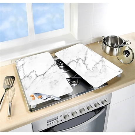 Avec le set de 2 couvres-plaque motif marbre apportez une touche d’élégance à votre cuisine ! En plus de cet aspect raffiné et travaillé de marbre, ces couvres-plaque protège efficacement votre cuisine. Pratiques, elles sont fabriquées en verre trempé et fonctionne sur tous types de plaque.
