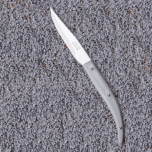 Assemblée grâce à 3 rivets en inox à la lame, le manche en polypropylène blanc est solidement maintenu à la lame. Ce manche résiste durablement à l’usure ainsi qu’aux températures. Vos couteaux sont ainsi compatibles avec le lave-vaisselle même si un entretien à la main est recommandé.